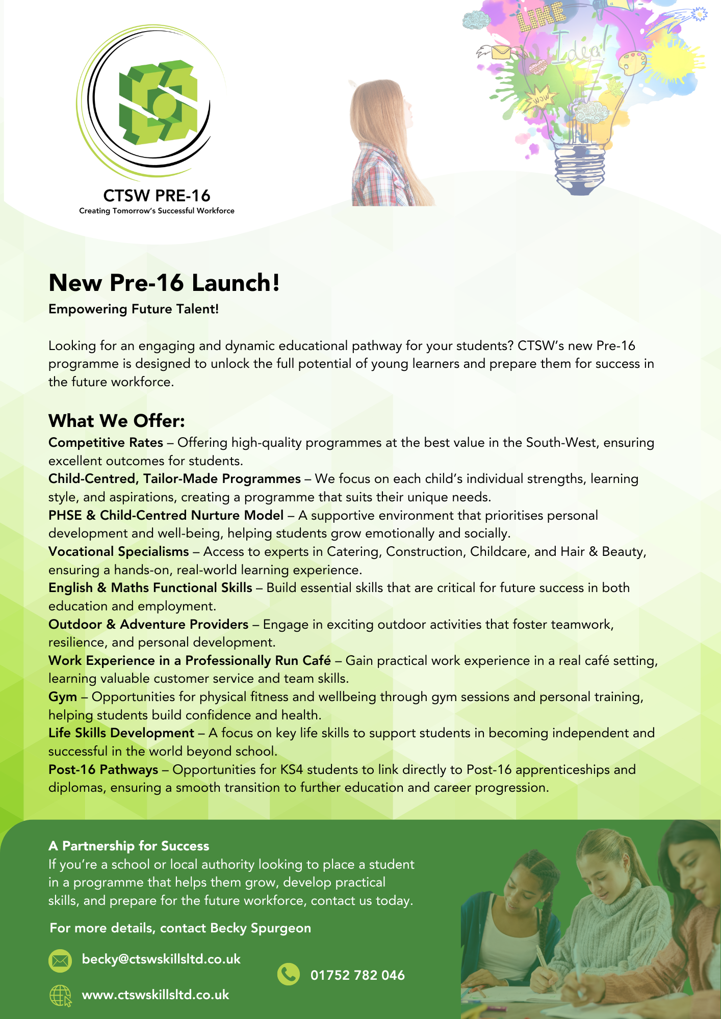 At CTSW, we offer a unique and supportive environment for Pre-16 learners, where the focus is on recognising the potential in every individual, not just what is written on paper. We understand that each learner is unique, and we take pride in our ability to tailor our approach to meet the individual needs of every student, regardless of their background or learning style.